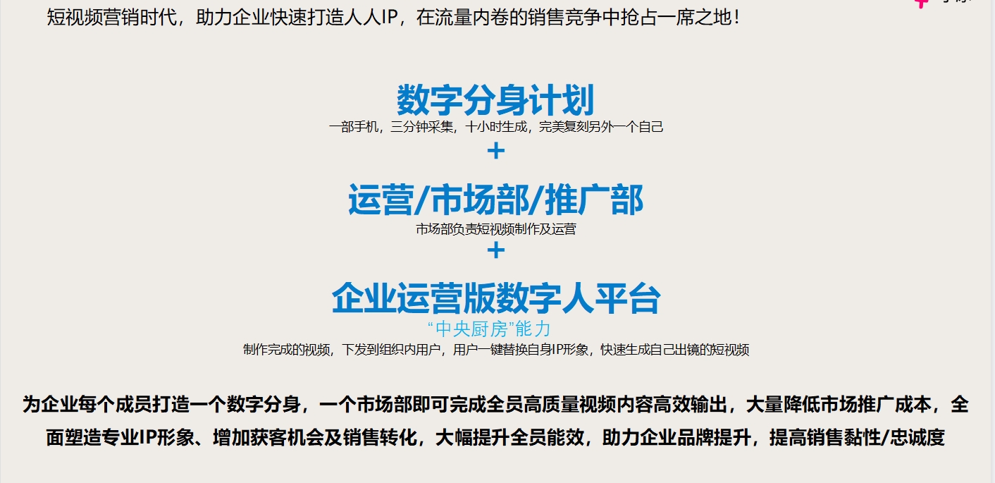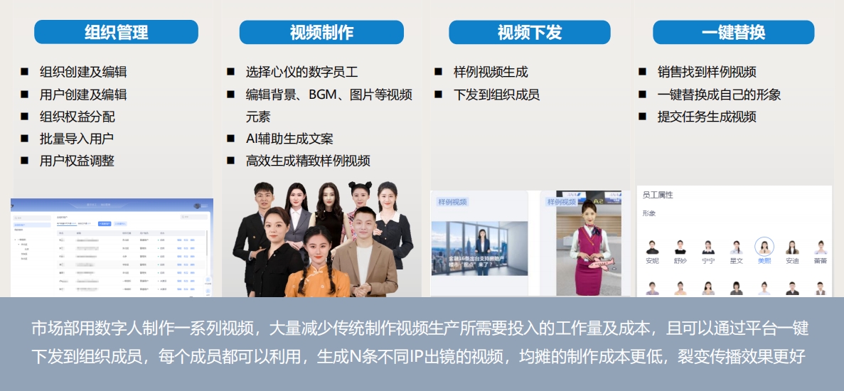 市場(chǎng)部用數(shù)字人制作一系列視頻,大量減少傳統(tǒng)制作視頻生產(chǎn)所需要投入的工作量及成本,且可以通過(guò)平臺(tái)一鍵下發(fā)到組織成員,每個(gè)成員都可以利用,生成N條不同IP出鏡的視頻,均攤的制作成本更低,裂變傳播效果更好。